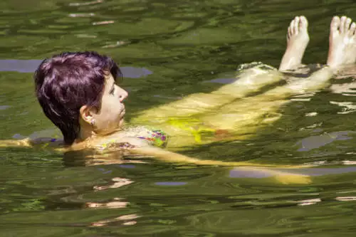 Na brehu je doslova hlava na hlave a je trochu problém nájsť voľné miesto na zloženie vecí. Ale dobre robíme, pretože pri veľkom jazere je od 13:00 do 15:00 je zákaz kúpania z hygienických dôvodov, ale pri nami zvolenom jazere to neplatí. Voda je príjemná (26°C) a informácie naozaj neklamali. Voda nadnáša viac ako v klasickom mori, ale musíš vyvinúť trochu aktivity aby si sa neponorili. Ale je to naozaj minimum aktivity. A tak i naši účastníci zájazdu, ktorí majú nejakú fóbiu (musí vidieť na dno, nie ja taký dobrý plavec) sa prekonávajú a užívajú si vodu plnými dúškami. Koncentrácia soli je tu ozaj dosť vysoká a preto sa nachádzajú pri každom východe sprchy so sladkou vodou. Ak sa neosprchuješ, už po pár minútach sa ti na pokožke vykryštalizuje soľ.